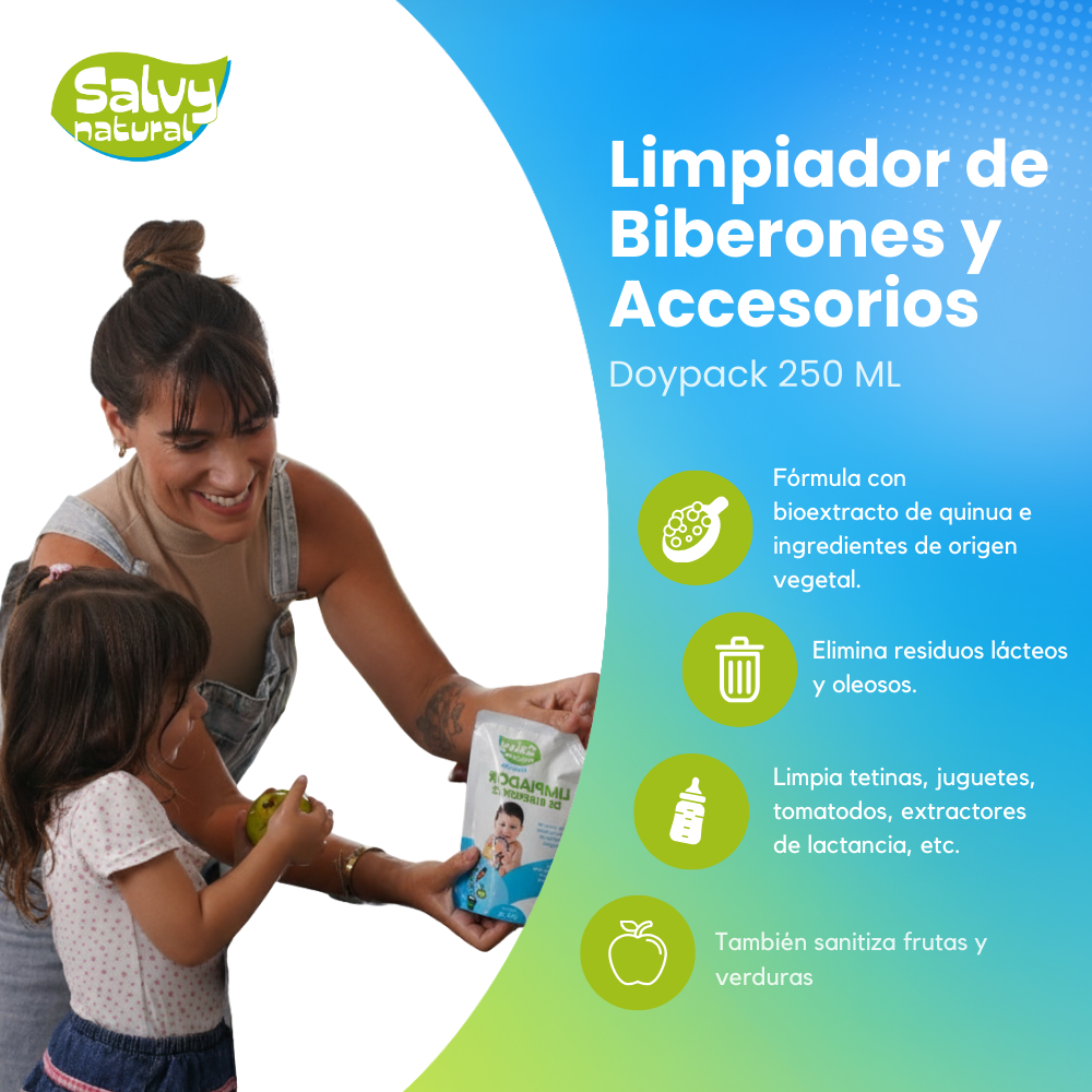 El Limpiador Natural Salvy está especialmente formulado para ofrecer una limpieza profunda, segura y delicada para tu bebé. Su fórmula biodegradable y eco-friendly combina bioextracto de quinua con ingredientes de origen vegetal y grado comestible, brindando suavidad a tus manos y protegiendo la salud de toda la familia.